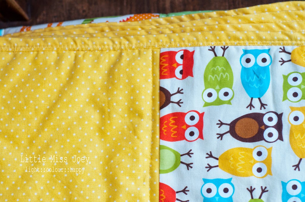 How did I choose the fabrics? Well, I wanted something with animals, that was mandatory. I wanted yellow as a unifying element and knew all along my binding would be yellow. I thought I'd find some baby fabrics, with a few animals in pastel-y colours; I didn't. Instead, I fell in love with these strong coloured oh so very happy animal prints and that was that. Once I had those, I needed to pick some solid fabrics to bring it all together; Rosie was essential in this and after a bit of trial and error, we nailed it! Originally, I wanted the backing to be yellow but once I saw those cute little owls I knew I had THE quilt for me.